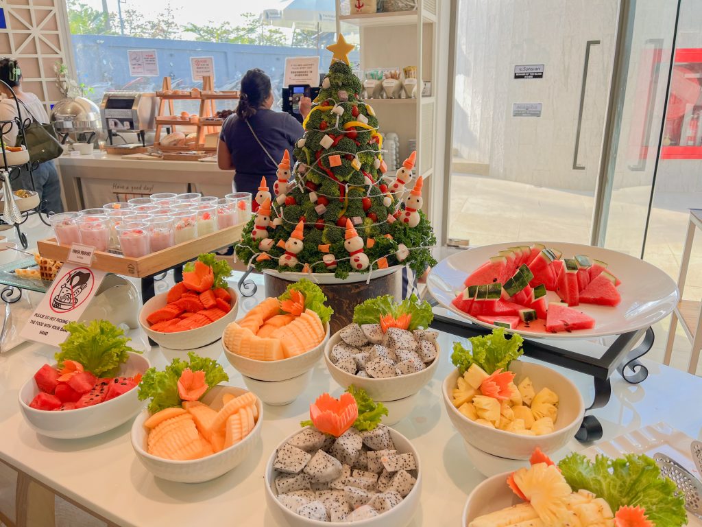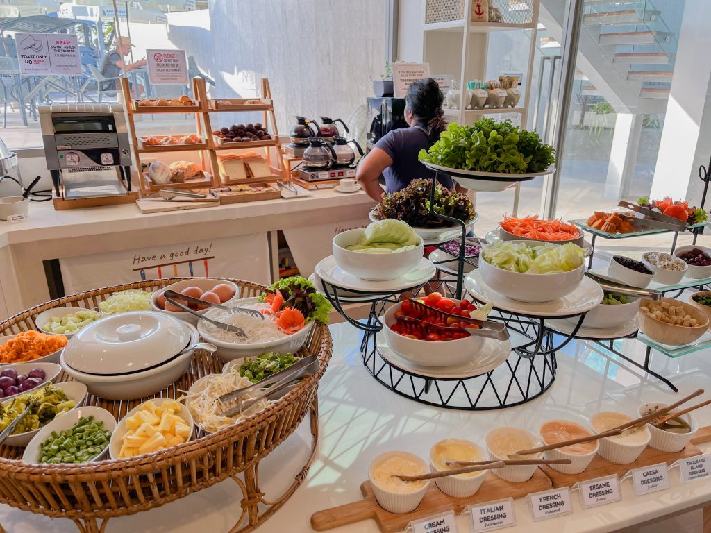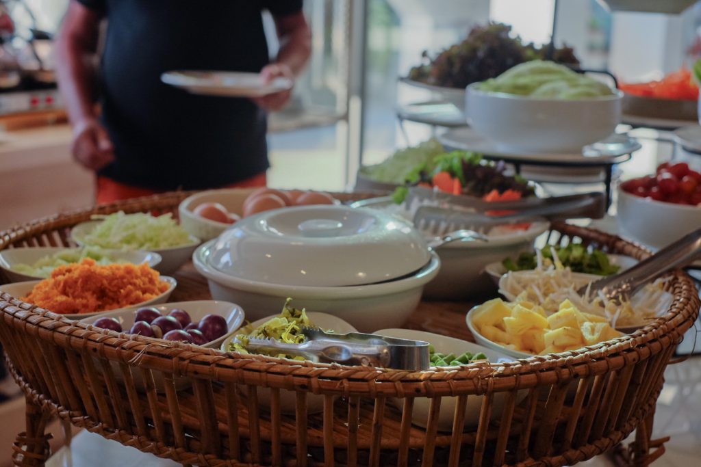 タイ料理と洋食、野菜やフルーツ、パンが並びます。